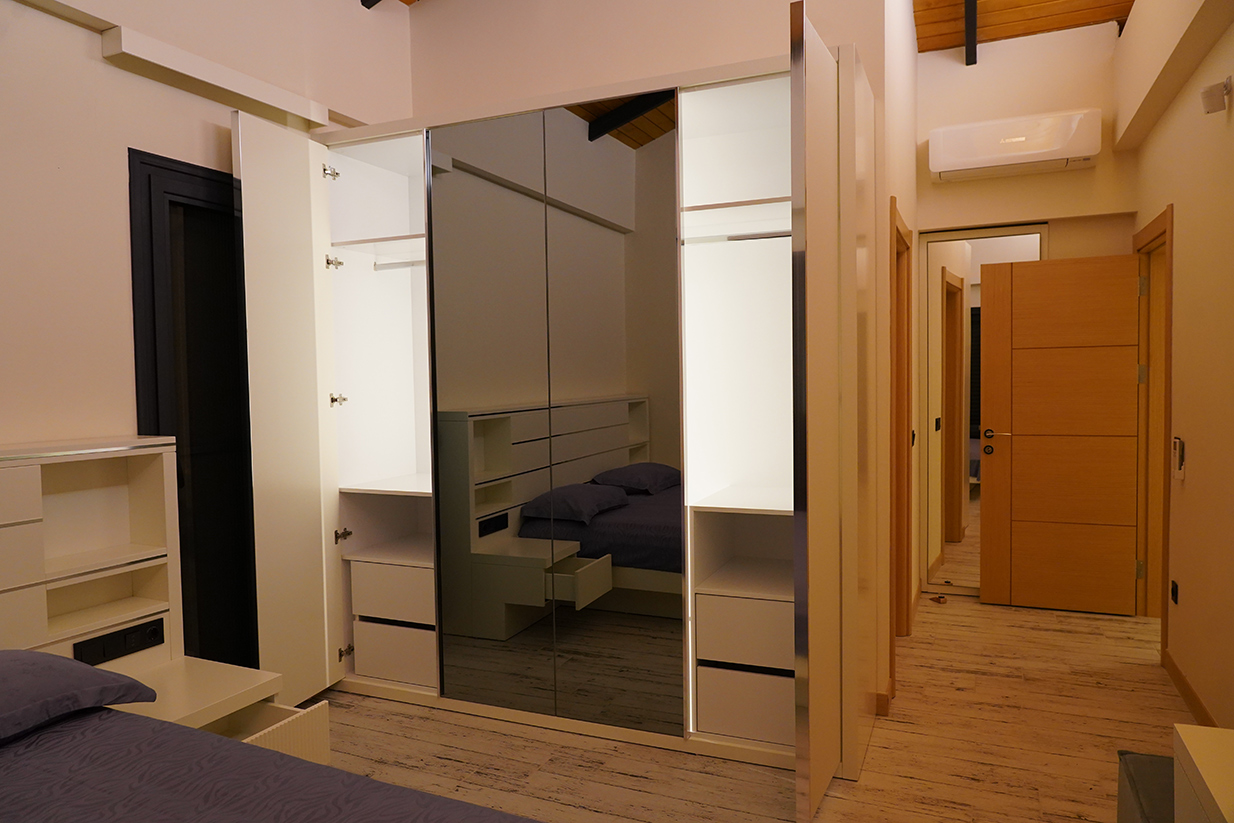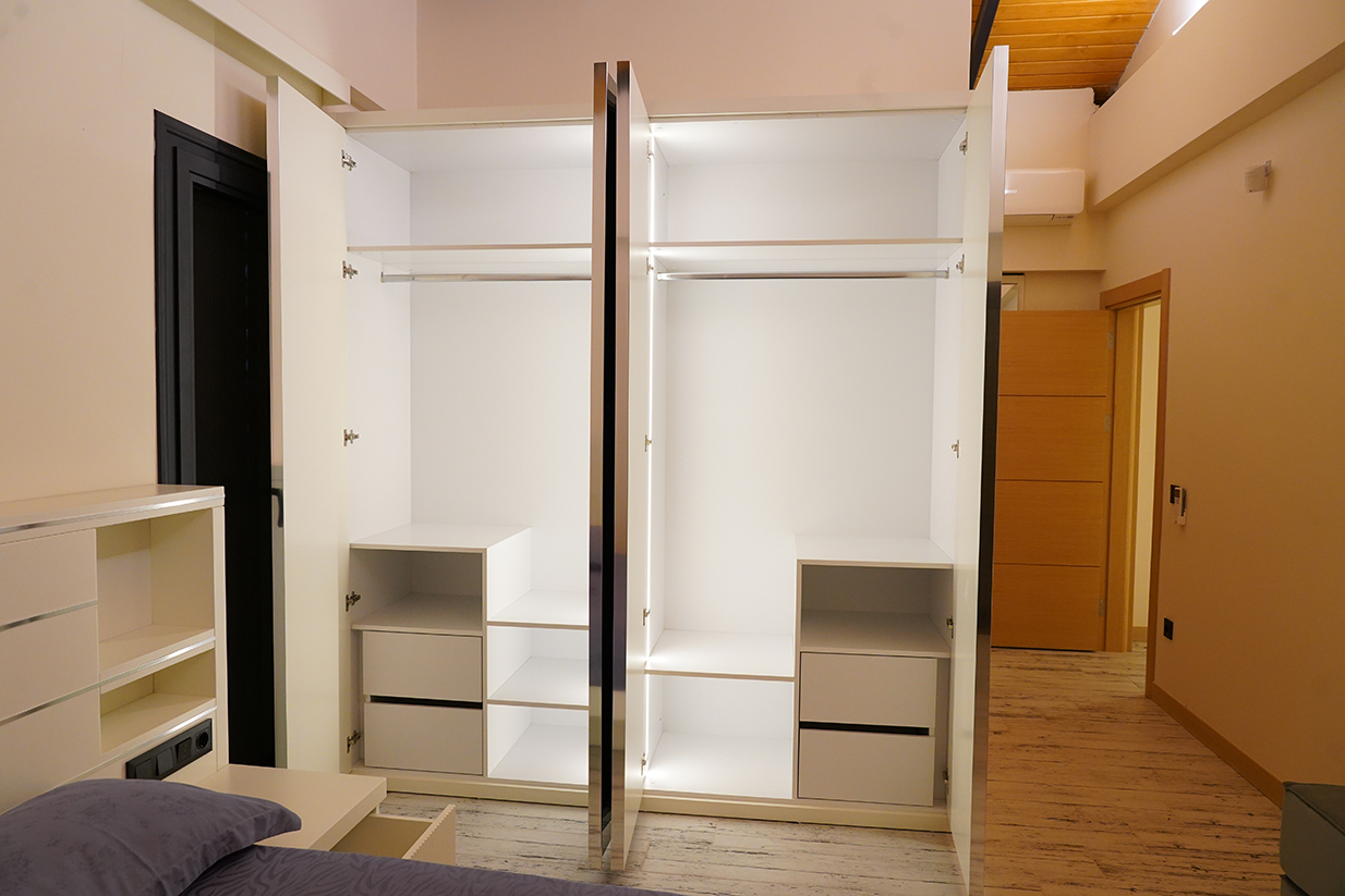 - Donanım ve Aksesuarlar: Askılık barları, pantolon askıları, çekmece içi düzenleyiciler, ayakkabı rafları gibi donanımlar eklenir.