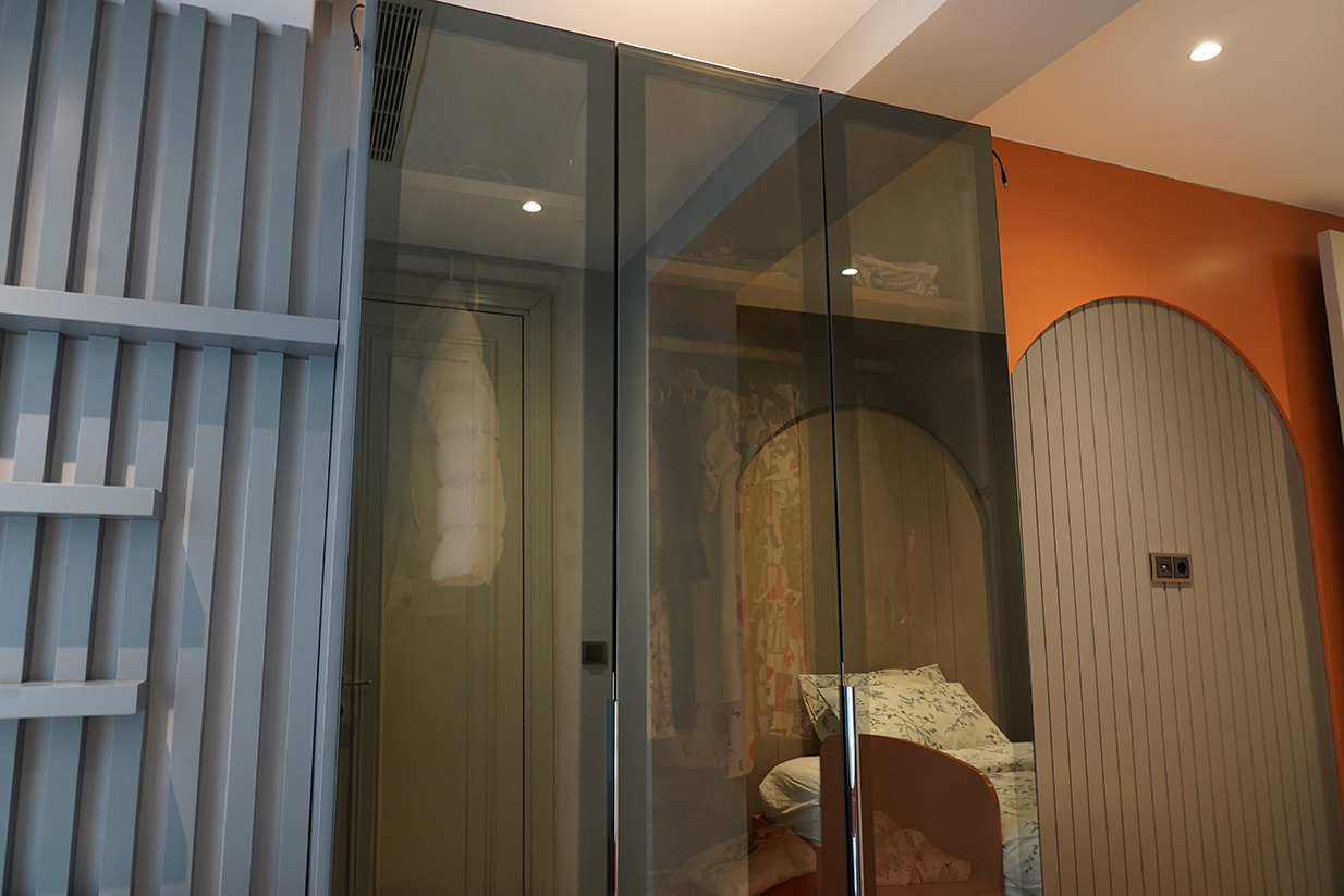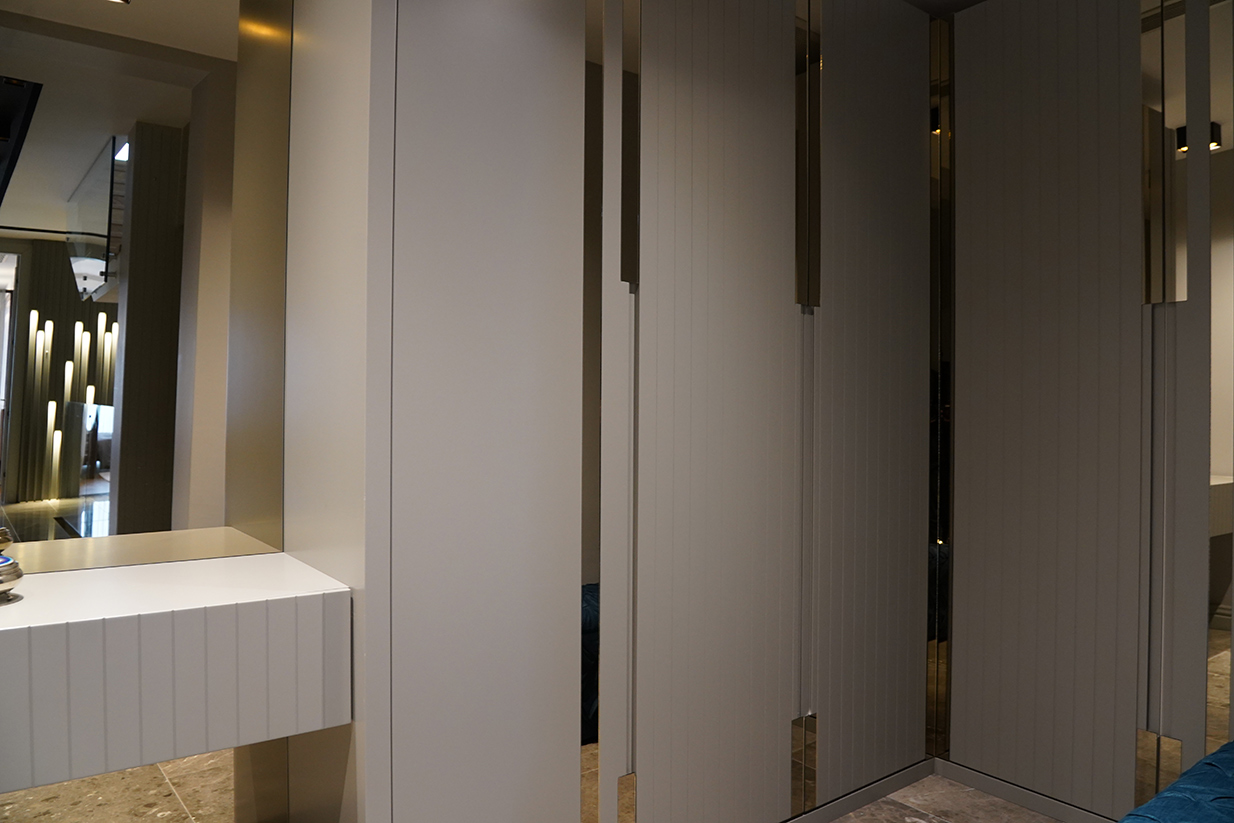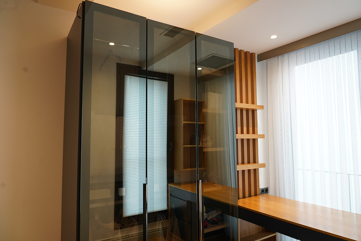- Fonksiyonel Tasarım: Giyinme dolabı işlevsellik açısından tasarlanır. Bölmeler, raflar, çekmeceler, askılık alanları, pantolon askıları gibi her türlü özellik ve detay hesaplanır. Bu tasarım aşamasında, dolabın iç düzeninin verimli ve ergonomik olması sağlanır.